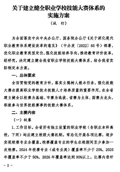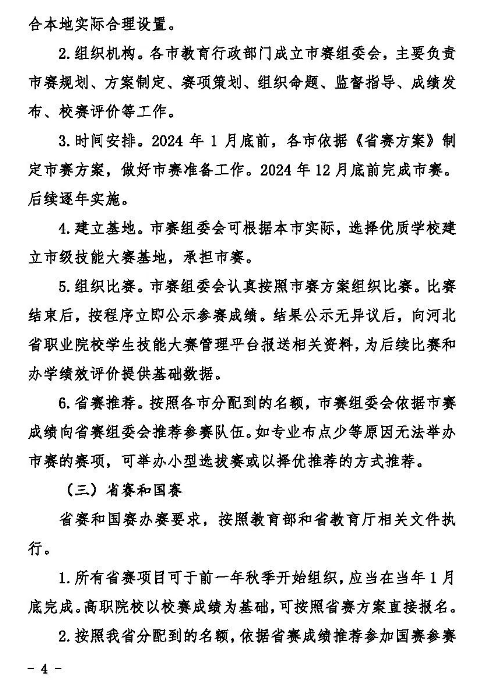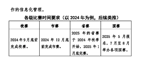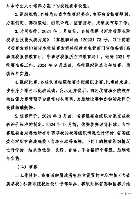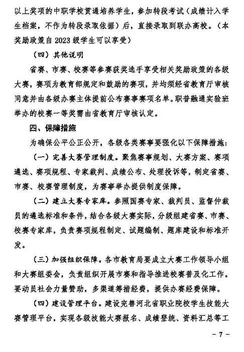 (四)其他說明省賽、市賽、校賽等參賽獲獎選手享受相關獎勵政策的各級大賽,賽項為教育部規定和鼓勵的賽項,并均須經省教育廳審核同意并由各級辦賽主體提前公布賽事賽項名單。職普融通實驗班舉辦的校賽一等獎需由省教育廳審核認定。