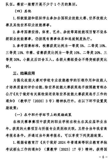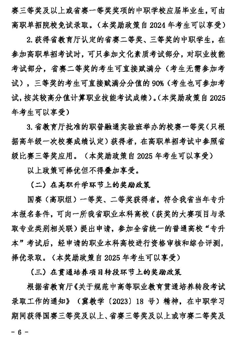 (三)在貫通培養項目轉段環節上的獎勵政策根據省教育廳《關于規范中高等職業教育貫通培養轉段考試錄取工作的通知》(冀教學〔2023〕18號)精神,在中職學習期間獲得國賽三等獎及以上、省賽三等獎及以上或市賽二等獎及以上獎項的中職學校貫通培養學生,參加轉段考試(成績計入學生檔案,不作為轉段錄取依據)后,直接錄取到聯辦高校。(本獎勵政策自2023級學生可以享受)