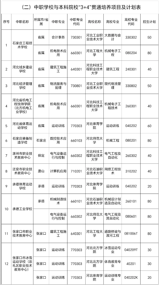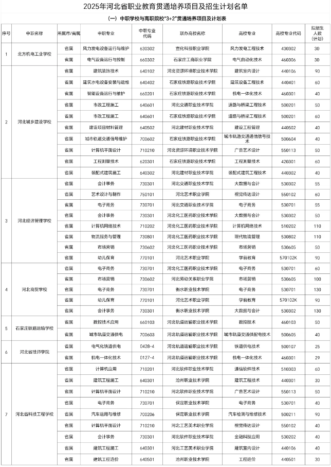河北省教育廳關(guān)于2025年3+2大專、3+4本科、五年一貫制招生計(jì)劃的公示,根據(jù)《關(guān)于做好職業(yè)學(xué)校2025年貫通培養(yǎng)項(xiàng)目工作的通知》(冀教職成〔2025〕4號(hào))和《關(guān)于開展“3+2”“3+4”貫通培養(yǎng)項(xiàng)目教育質(zhì)量評(píng)價(jià)工作的通知》(冀教職成函〔2024〕15號(hào))要求,在各市及省屬職業(yè)院校就2025年擬舉辦的貫通培養(yǎng)項(xiàng)目進(jìn)行申報(bào)和備案基礎(chǔ)上,經(jīng)研究,確定了2025年“3+2”“3+4”“5年一貫制”貫通培養(yǎng)項(xiàng)目及招生計(jì)劃(詳見附件),現(xiàn)予以公示,公示時(shí)間為4月7日-11日。